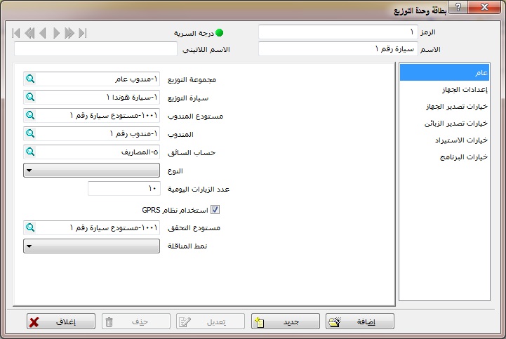تستخدم هذه البطاقة لتعريف كافة وحدات التوزيع الموجودة في الشركة، سواء كانت وحدة التوزيع مكونة من موزع واحد أو موزعين اثنين. من خلال هذه البطاقة ستتمكن من تحديد طريقة عمل الموزعين التابعين لوحدة التوزيع هذه، كما ستتمكن من تحديد بعض الخيارات الخاصة بجهاز البالم الخاص بهذا الموزع. يمكن طلب هذه النافذة من: