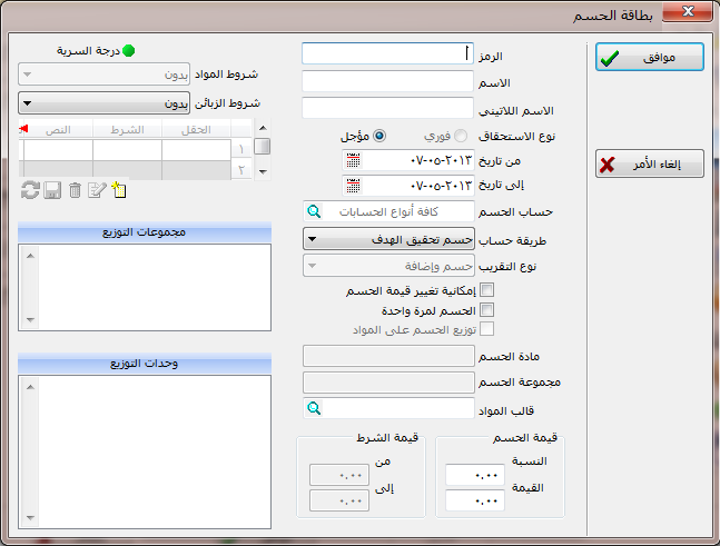 يوفر لك نظام التوزيع تعريف عدد كبير من أنواع الحسميات التي يمكن تقديمها للأنواع المختلفة من الزبائن، وذلك وفق شروط مختلفة مع إمكانية الاختيار بين التطبيق الفوري أو المؤجل لكل من هذه الحسميات. ويتم الوصول إلى هذه النافذة من: