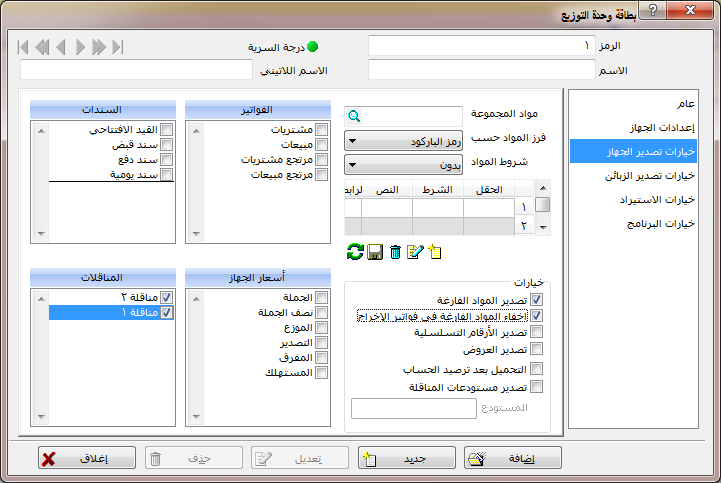 لا يمكن للمستخدم استعراض أنواع المناقلات المعرفة في هذه الخانة إلا في حال تفعيل هذه المناقلات من بطاقة وحدة التوزيع – صفحة خيارات تصدير الجهاز