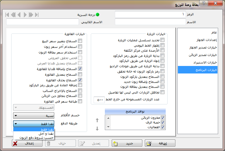 هنا يتم تحديد نوع طريقة الدفع من خلال الاختيار من القائمة المنسدلة الظاهرة جانباً و التي تتضمن ثلاثة خيارات وهي: نقداً فقط، نقداً وآجل و حسب شروط دفع الزبون.