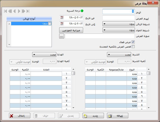 تستخدم هذه النافذة لتحديد العرض المقدم إلى الزبائن من الشركة. وق ذتم إضافة الميزات التالية: