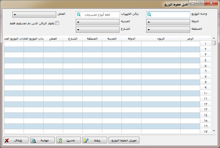 تستخدم هذه النافذة لتحديد الزبائن التي سيتوجب على كل موزّع زيارتهم في كل يوم من أيام دورة التوزيع. وقد تم إضافة وتعديل بعض الميزات في هذه النافذة: