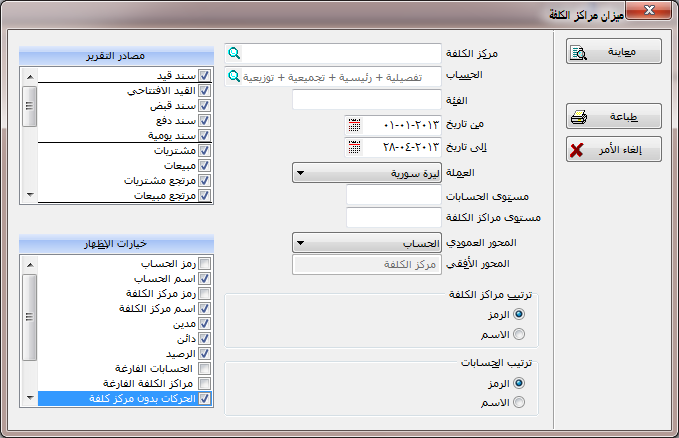 بتفعيل هذا الخيار تظهر الحركات التي دون مركز كلفة.