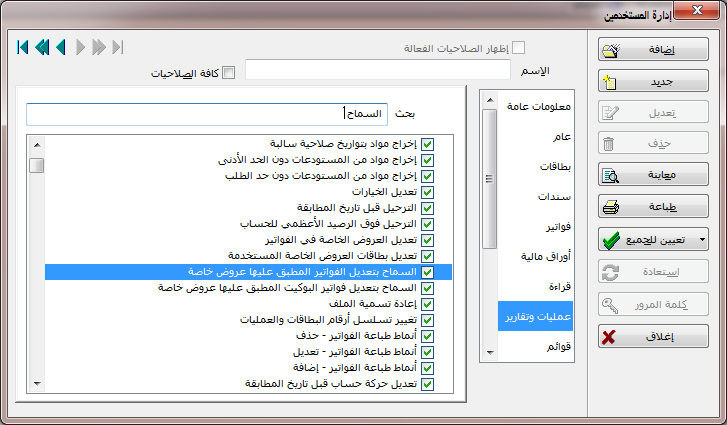 يوفر البرنامج إمكانية حجب التقارير والعمليات عن المستخدمين حسب صلاحية كل مستخدم. إضافة الخيارين التاليين: