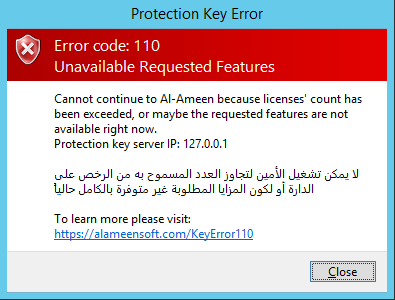يظهر هذا الخطأ عندما لا يتوفر على دارة الحماية المستخدمة لتشغيل برنامج الأمين أي رخصة من الرخص الأساسية المطلوبة لتشغيل البرنامج وذلك بسبب استهلاك جميع الرخص من قبل مستخدمين آخرين.
