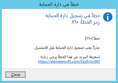 يظهر هذا الخطأ عند بداية تشغيل أو خلال عمل برنامج الأمين نتيجة عدم تسجيل دارة الحماية وانتهاء المدة السموح خلالها تجاوز التسجيل.